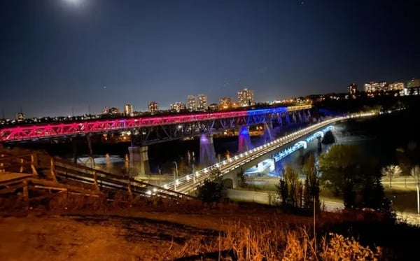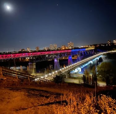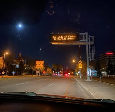 That same evening, the High Level Bridge in Edmonton was lit up in honour of the 7th anniversary of the start up of the Foundation here in Canada. The bridge was lit in blue, red and yellow - the colours of our Foundation's logo. The sign just before the bridge announced to this special tribute to Our Lady of Kibeho Orphanage.